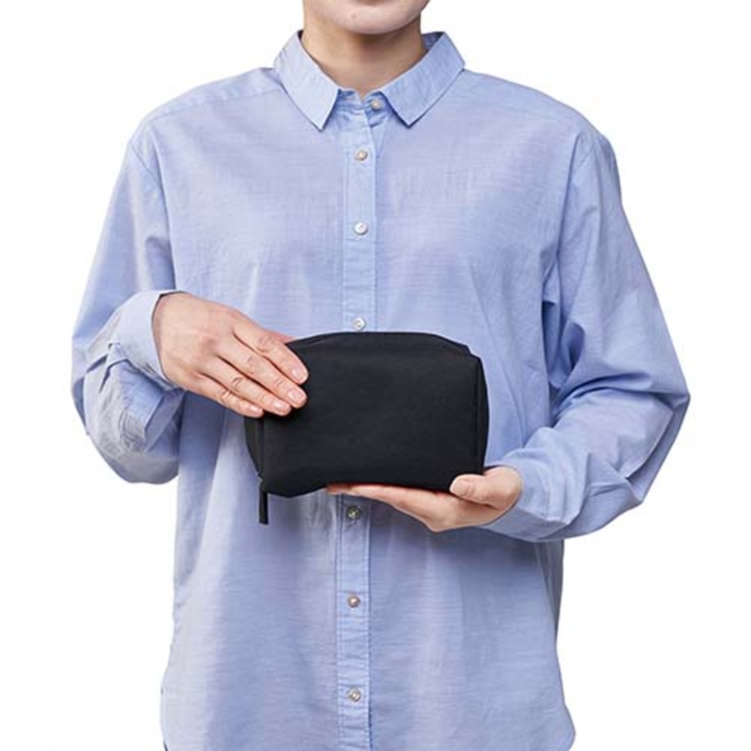 ベーシックスクエアポーチは、ポリエステルを使用し、内側ポケットと広めのマチにより大容量のポーチです。 本体サイズは縦100mm×横170mm×マチ70mmで、コスメグッズやトラベル用の小物などを収納できます。 本体色は、ミルキーベージュ・インクブラックの2色展開です。 コの字型のファスナー仕様で、中身の出し入れがしやすくなっています。