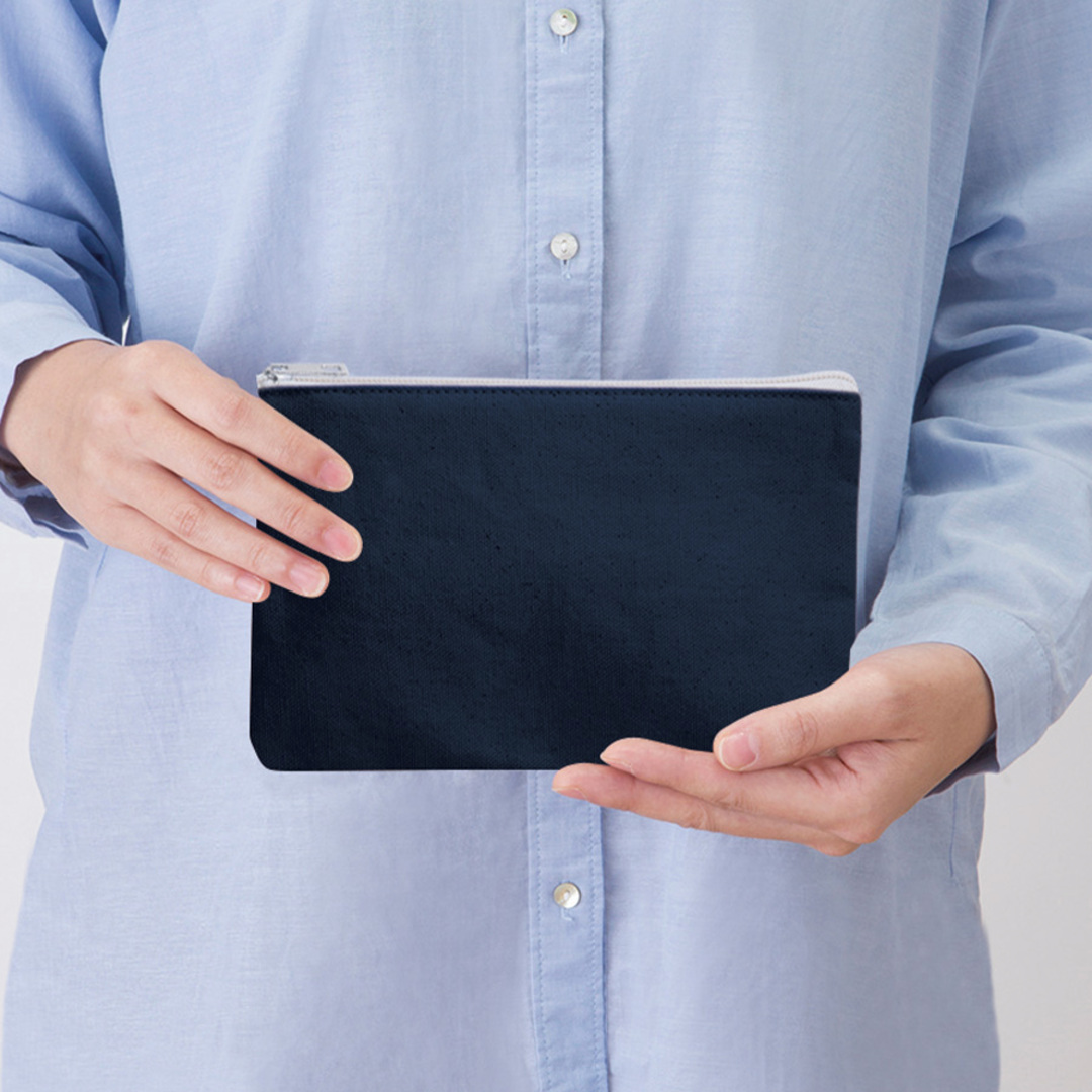 お問い合わせフォームはこちらキャンバスフラットポーチ(S)は、コットンを使用した、10オンスのキャンバス生地のマチなしポーチです。 本体サイズは縦120mm×横200mmで、8.3インチタブレットや長財布、文庫本などを収納できます。 本体色は、ナチュラル・ミッドナイトブルー・ナイトブラックの3色展開です。