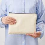 お問い合わせフォームはこちらキャンバスフラットポーチ(L)は、キャンバス生地が使用されたユニセックスなLサイズのフラットポーチです。 本体サイズは縦200mm×横270mmで、8.3インチタブレットや長財布、文庫本などを収納できます。 本体色は、ナチュラル・ミッドナイトブルー・ナイトブラックの3色展開です。