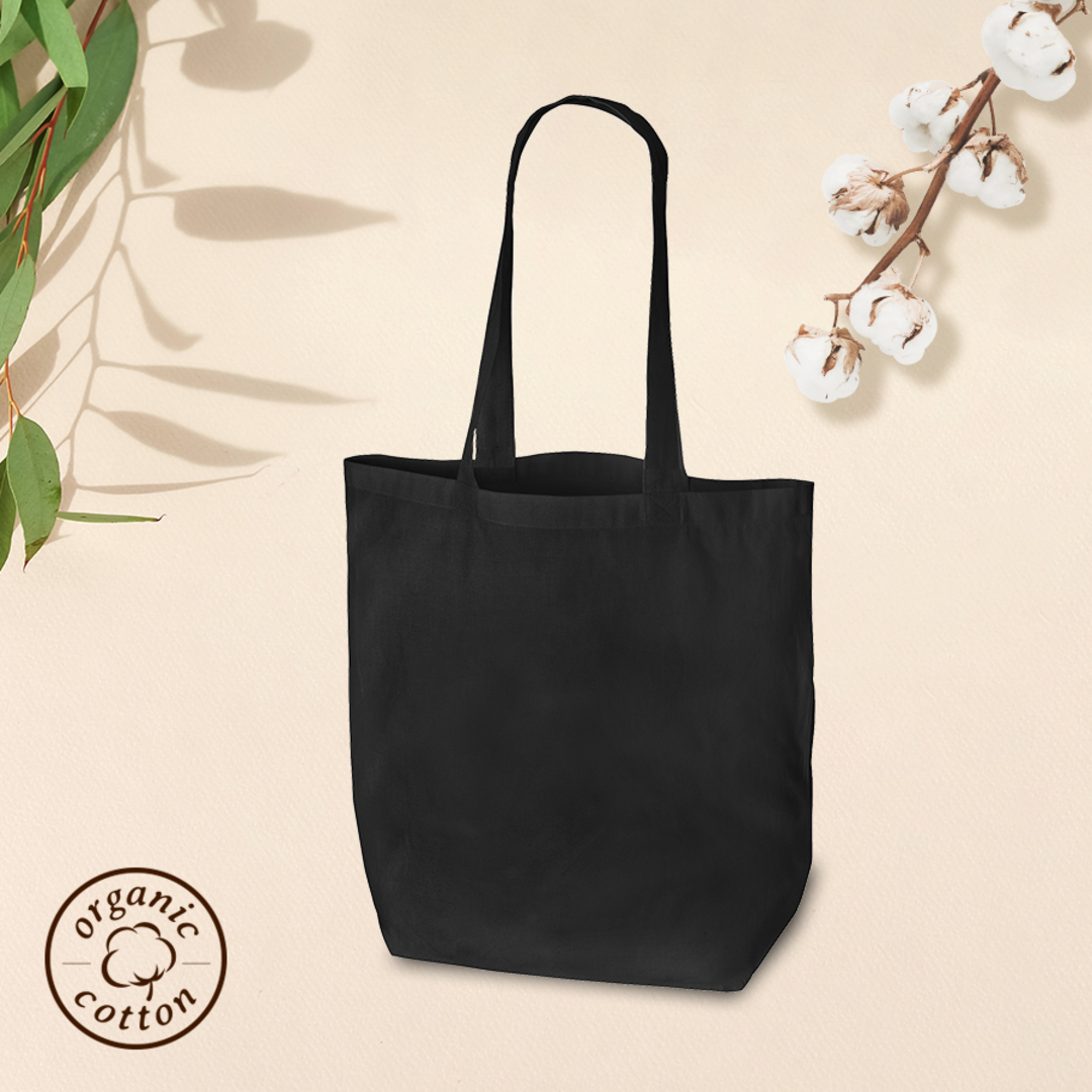 オーガニックコットンバッグ(M)はオーガニックコットンを使用したA4サイズの書類が入って肩掛けができるMサイズのコットンバッグです。本体サイズが約360×370×110mmの船底タイプです。