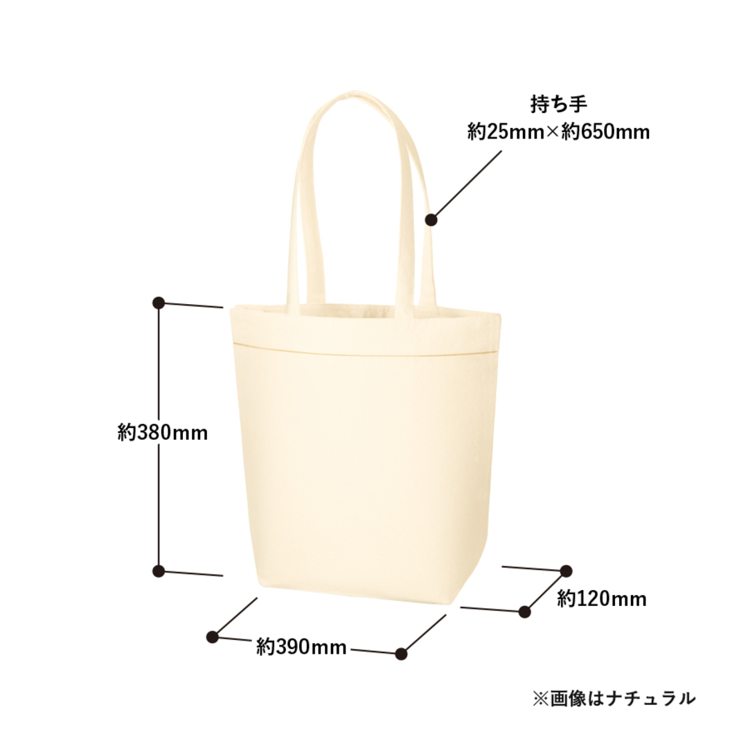 キャンバスベルトライントートは10オンスのコットン生地を使用した口元のラインが特徴的な容量約12Lのトートバッグです。本体サイズが約390x380x120mmです。