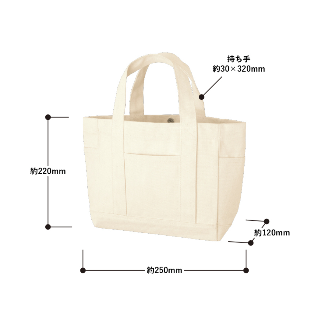 厚手キャンバスポケットマルチトート(S)は3つのマルチポケットと口元のマグネットホックが付いた14オンス厚手コットン生地を使用したSサイズのトートバッグです。本体サイズは250mm×220mm×120mmです。